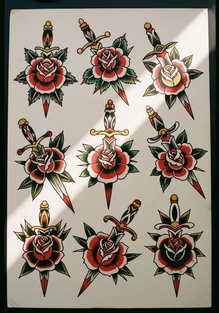I ve always thought the dagger-and-rose combo perfectly sums up life s contrasts beauty and pain, love and loss. There s something powerful about that symbolism, and I can see why it s one of the most beloved traditional designs ever made.