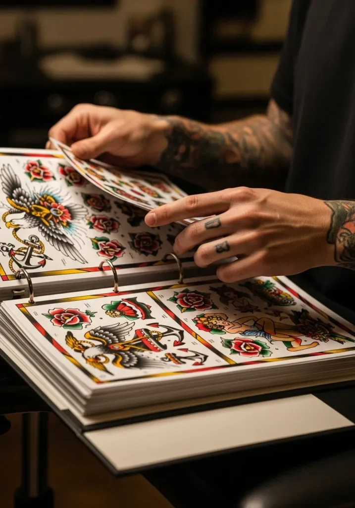 This photo captures the heart of tattoo artistry a heavily tattooed artist flipping through a binder packed with vibrant flash sheets. Each page is bursting with bold eagles, anchors, roses, and pin-up figures, perfectly framed in thick black lines and rich traditional colors. The setup feels nostalgic and authentic, like flipping through history one sheet at a time.