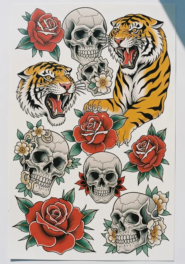 This flash sheet features roaring tigers, blooming roses, and stark skulls, all drawn with razor-sharp lines and saturated traditional hues. The tigers orange coats pop beautifully against the soft gray of the skulls and the rich reds of the roses. It s a perfect mix of life and death, beauty and danger.