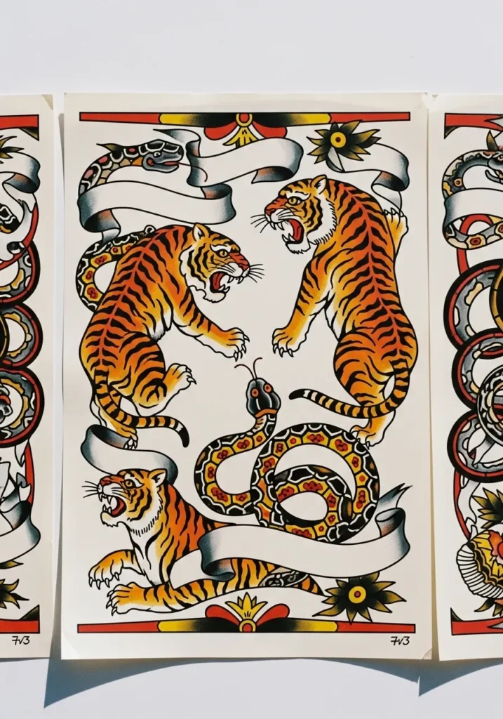 These twin sheets bring together roaring tigers, gliding swallows, coiled snakes, and thorny roses all classic staples of traditional tattoo flash. The rich orange, yellow, and red tones contrast beautifully with the deep blacks and greens, creating a layout that feels fierce and alive.