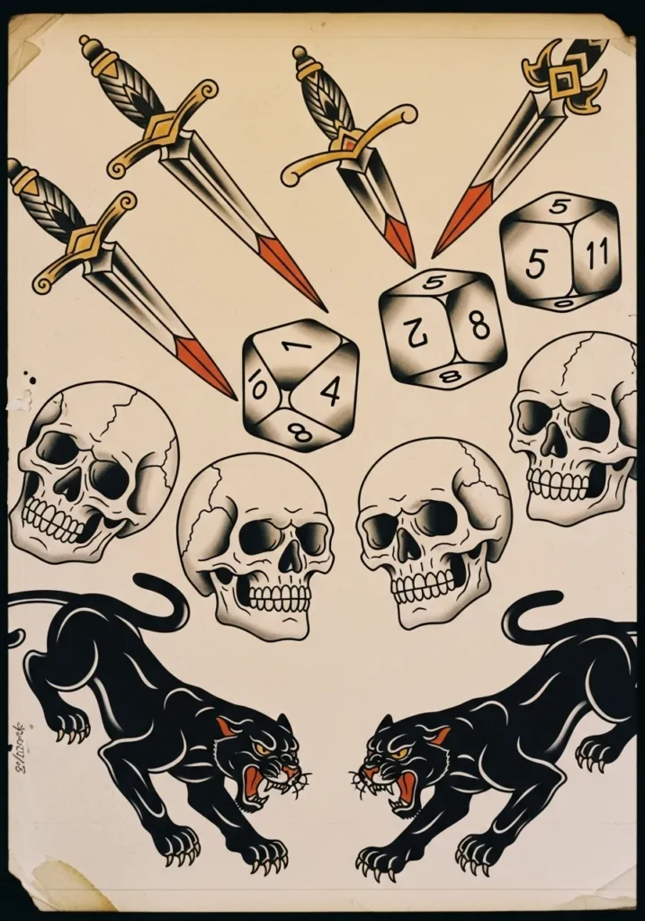 This flash sheet is pure bold energy featuring glinting silver daggers with red-tipped blades, menacing skulls, black panthers mid-snarl, and a few classic dice for that lucky (or risky) touch. The black and red palette feels intense and confident, while the crisp outlines give every piece that sharp, unmistakable old-school vibe. Each design looks ready to leap off the page and onto skin.