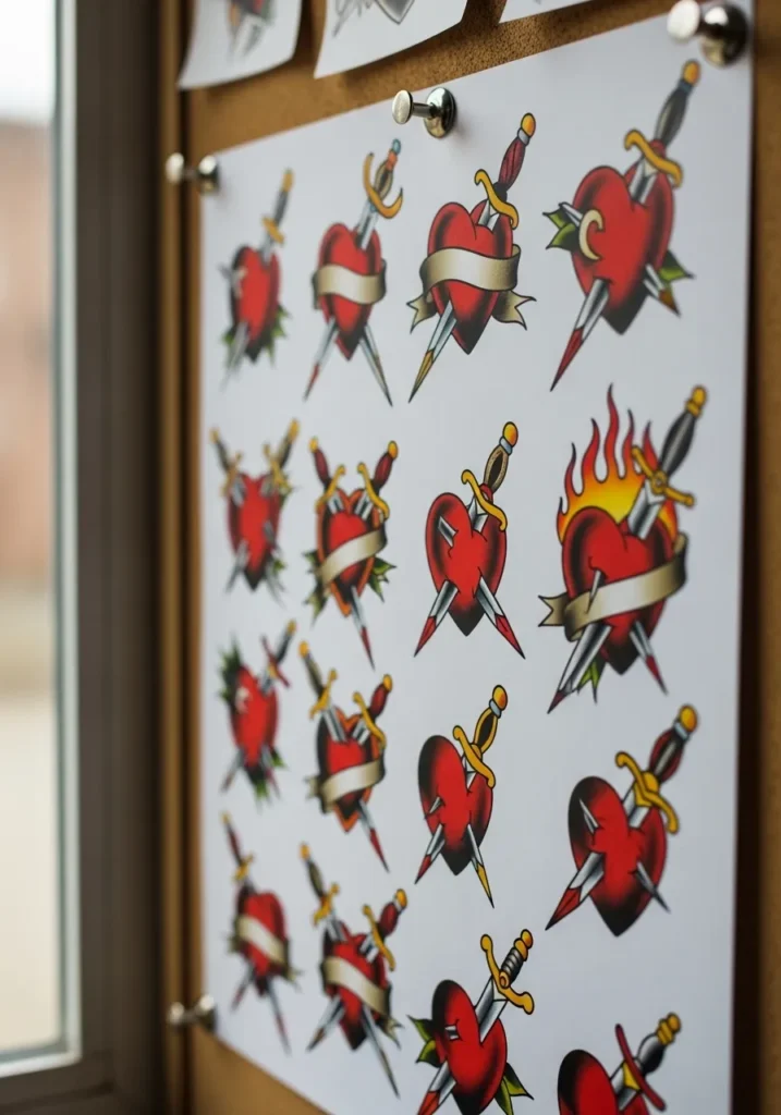 Bold red hearts pierced with gleaming silver daggers, framed by bright green leaves and lush roses this flash sheet is pure passion and symbolism. The tattoos feature those thick black lines and strong colors that define traditional American art, each design timeless enough to fit on an arm, chest, or even as a standalone centerpiece. The subtle shading and perfect symmetry give it that satisfying tattoo classic look.