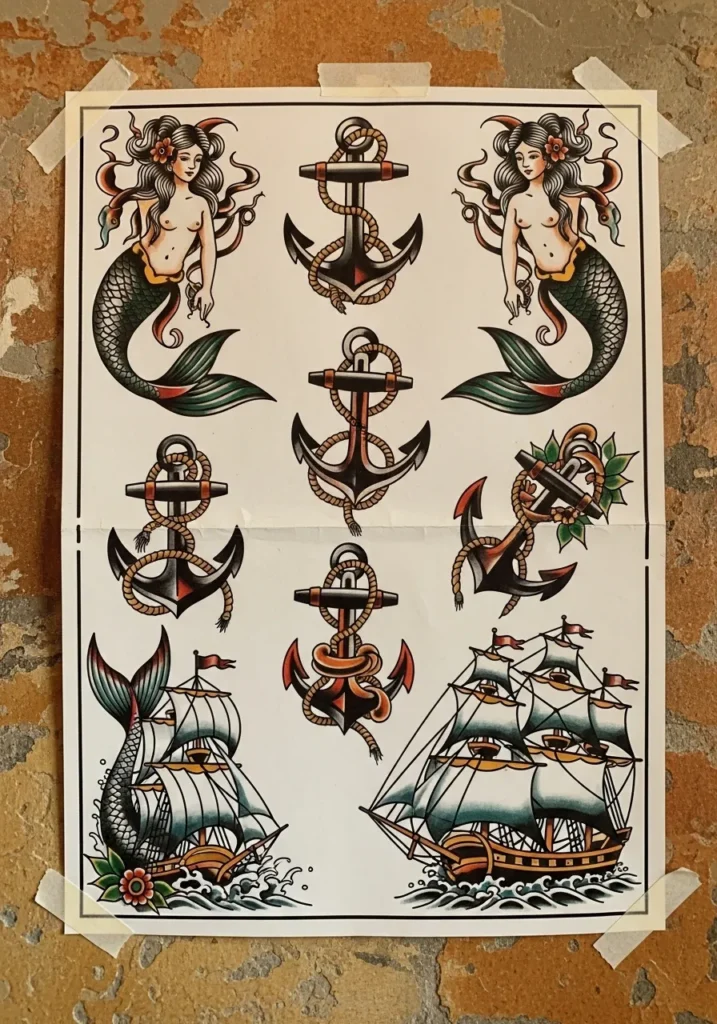 This flash sheet captures a full nautical fantasy with detailed anchors, sailing ships, and elegant mermaids. The colors are vivid and classic deep greens, bright reds, and crisp blacks arranged in a balanced layout that feels clean and timeless. Every design radiates that seafaring spirit of adventure and freedom.
