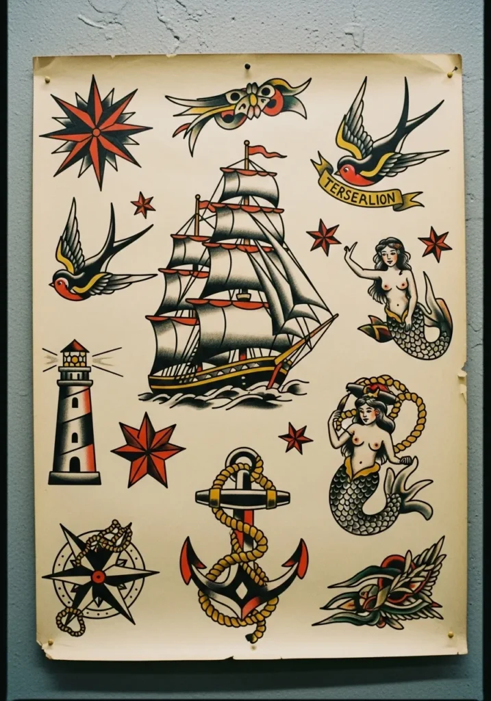 Featuring a compass, lighthouse, anchor, mermaid, and classic ship, this flash sheet captures everything that makes old-school tattooing so iconic. The colors are bright yet balanced, with golden ropes, bold reds, and deep navy tones that instantly make you think of salt air and faraway voyages. Every design looks crisp and ready to wear.