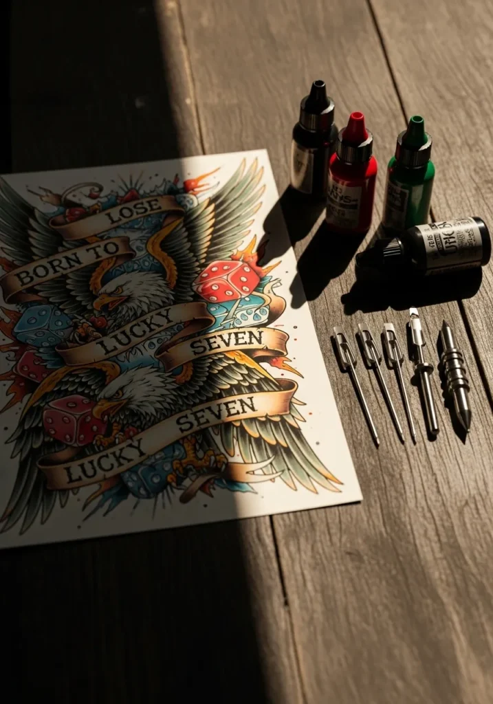 This tattoo sheet screams old-school charm with eagles, dice, and banners that read Born to Lose and Lucky Seven. The muted vintage palette of red, blue, and tan gives it that classic parlor feel. You can almost smell the ink and hear the buzz of a tattoo machine in the background.