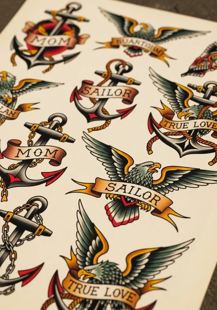 This design sheet features anchors wrapped in golden rope, proud eagles mid-flight, and banners declaring MOM, TRUE LOVE, and SAILOR. The combination of red, gold, and deep black ink gives each tattoo a powerful contrast and a true Americana look. Every detail feels crisp, confident, and steeped in old-school sailor tradition.