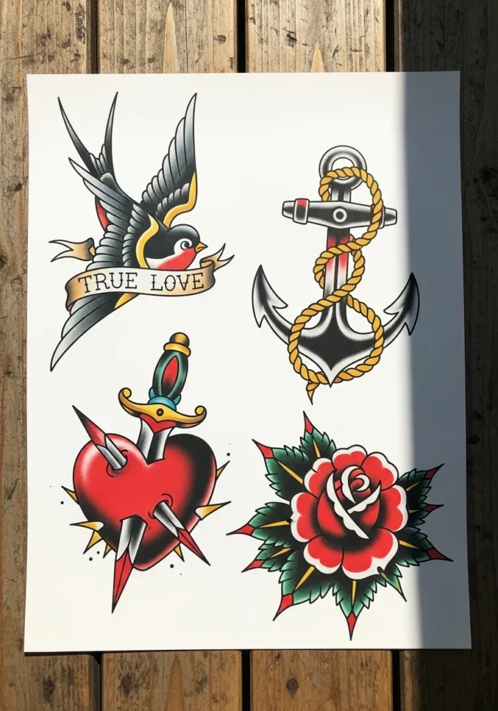 This minimal flash sheet highlights four timeless designs a swallow carrying a True Love banner, a heart pierced by a dagger, a bold red rose, and a golden anchor wrapped in rope. Each one embodies the essence of classic American tattooing with simple shapes and bold color choices.