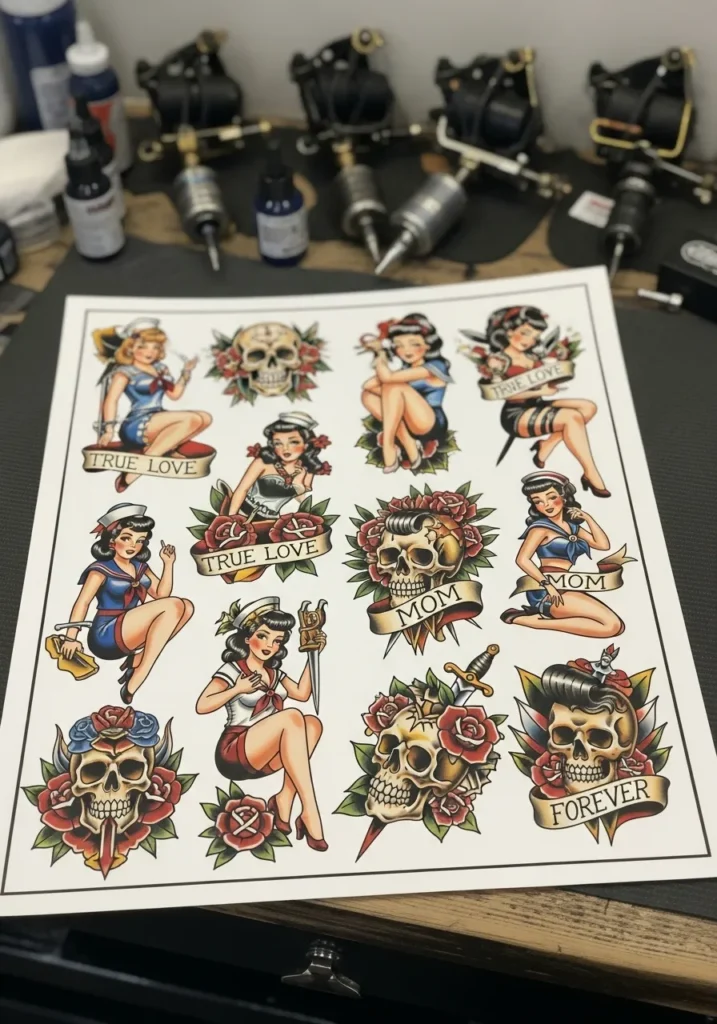 This flash sheet is packed with personality, featuring sultry sailor pin-up girls, skulls with roses, and banners reading TRUE LOVE, MOM, and FOREVER. The bold reds, navy blues, and golds create that classic tattoo color harmony everyone loves. Each design is clean, balanced, and full of retro flair.