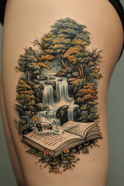 This tattoo is a breathtaking depiction of a serene natural scene flowing right out of the pages of an open book. The design features a beautiful waterfall cascading down into a peaceful forest, complete with lush trees and vibrant greenery. The colors are rich and earthy, giving the tattoo a lifelike feel that draws you into the scene. The open book at the base ties the entire image together, symbolizing how stories can create entire worlds within our imagination.
