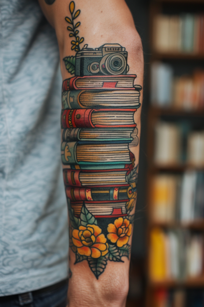 Stack of Books with Vintage Camera and Floral Accents Tattoo