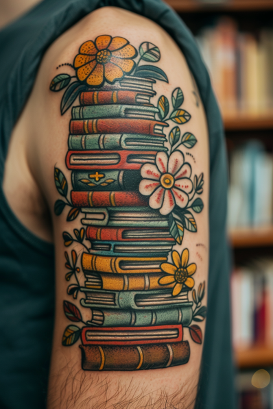 This tattoo is a vibrant homage to the love of reading, featuring a neatly stacked tower of vintage books adorned with blossoming flowers. The colors are warm and inviting, with rich reds, yellows, and greens that give the tattoo an almost retro feel. The flowers add a soft, whimsical touch, intertwining with the books as if they re a natural part of the stack. The overall design flows beautifully along the arm, making it an eye-catching piece for anyone who cherishes both nature and literature.