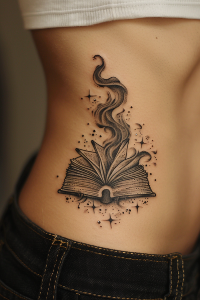 This tattoo showcases a magical spellbook with wisps of swirling smoke rising from its open pages. The black and gray shading adds a sense of depth and mystery, making the book look like it s brimming with ancient, powerful spells. The smoke, artfully curling upwards, is dotted with tiny stars and sparkles, giving the design a mystical, otherworldly vibe. Placed on the ribs, this tattoo is both enchanting and subtle, offering a captivating blend of fantasy and elegance.