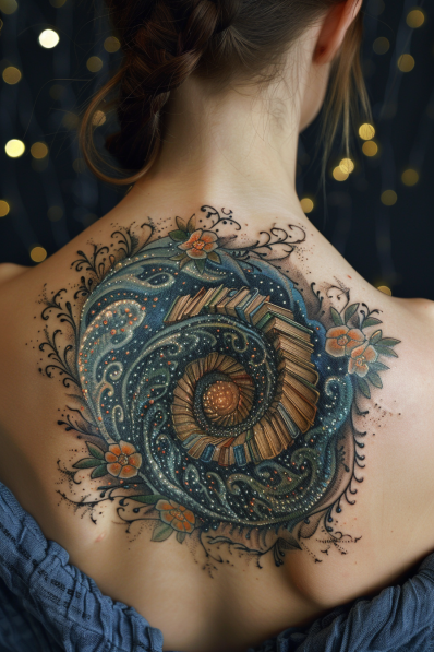 This tattoo features a mesmerizing spiral of books that appears to swirl into a cosmic abyss, surrounded by delicate floral patterns and sparkling stars. The design beautifully combines earthy tones of the books with the deep blues and shimmering golds of the cosmic background, creating a dynamic and visually captivating piece. The intricate details of the flowers and the swirling motion of the books draw you into the tattoo, making it feel like a portal to another dimension, where knowledge and the universe are intertwined.