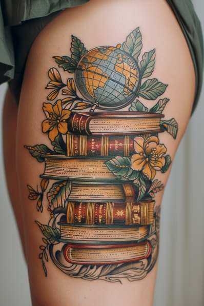 This tattoo is a vibrant celebration of both knowledge and wanderlust, featuring a stack of richly detailed books topped with a classic globe. The colors are warm and inviting, with shades of yellow, green, and brown giving the design a vintage feel. The books are meticulously inked with a sense of age and wisdom, while the globe sits proudly on top, symbolizing the endless possibilities that come with learning and exploration. The surrounding flowers and leaves add a natural, organic touch, making the entire piece flow beautifully along the curve of the thigh.