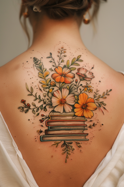 This tattoo is a stunning blend of nature and literature, featuring a stack of classic books topped with a vibrant bouquet of wildflowers. The colors are soft yet striking, with shades of orange, pink, and green bringing the flowers to life against the skin. The delicate sprigs and leaves add a sense of movement, as if the flowers are gently swaying in a breeze. The tattoo is beautifully placed on the upper back, creating an elegant and expansive design that s as eye-catching as it is meaningful.