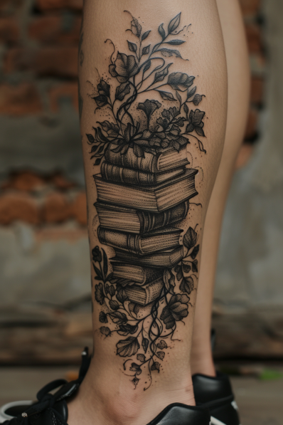 Honestly, this tattoo is like wearing a piece of poetry on your skin. The combination of books and flowers makes it feel both intellectual and romantic a perfect fit for someone who finds solace in both the written word and the beauty of nature. It s big enough to make a statement but still has that softness that makes it feel personal and warm. If you re a book lover who also appreciates the natural world, this tattoo really brings both passions together in a beautiful way.