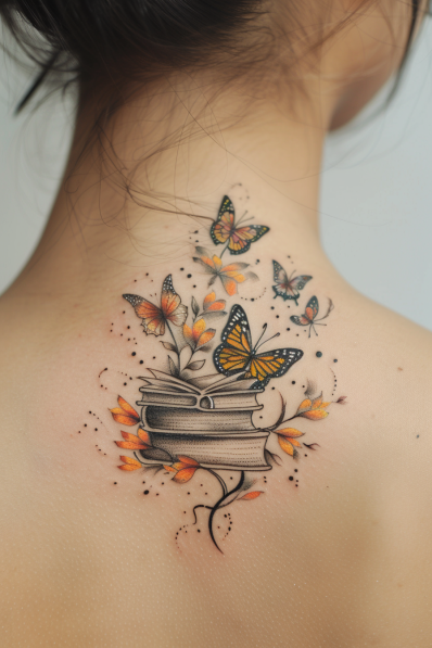 Butterflies and Books Tattoo with Floral Accents