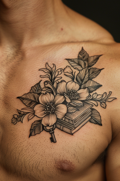 This tattoo features an antique book paired with a vintage key, beautifully nestled among detailed flowers and leaves. The design is done in a classic black and gray style, with the shading adding depth and a sense of age to the book, making it look like a cherished old volume. The key, lying atop the book, adds an element of mystery, as if it holds the secret to unlocking the knowledge within. The intricate floral elements surrounding the book and key soften the design, creating a balanced mix of strength and elegance on the chest.