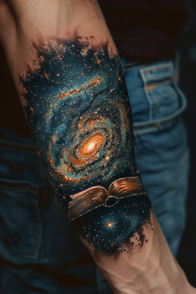 Cosmic Galaxy Emerging from Book Tattoo
