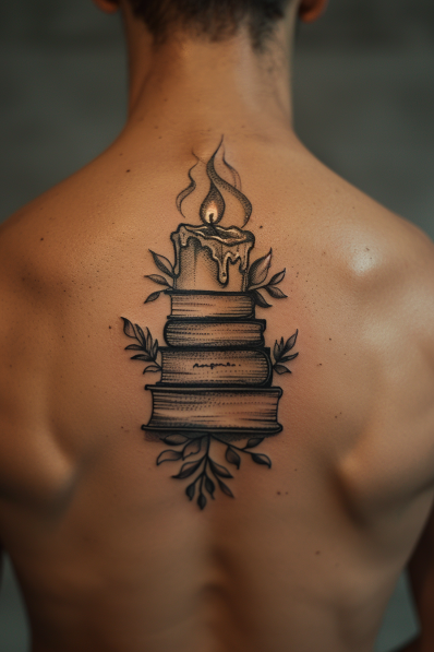 I really appreciate how this tattoo symbolizes knowledge as a guiding light. The candle on top of the books represents wisdom and the idea that learning can illuminate life s journey. The added leaves give it a sense of growth and life, making this tattoo not only visually appealing but also rich in meaning.