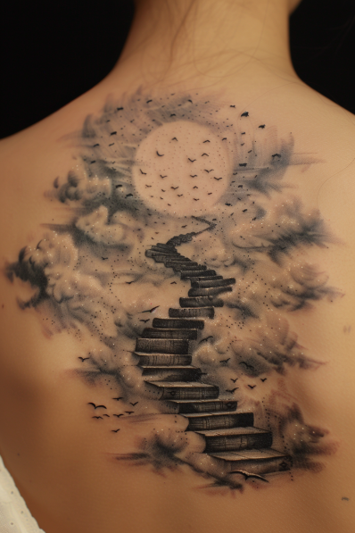 This tattoo features a surreal and dreamy design of a stairway made entirely of books, leading up through the clouds towards a full moon. The black and gray shading creates a soft, ethereal atmosphere, with the clouds appearing almost mist-like as they swirl around the book staircase. The moon, large and luminous, serves as the ultimate destination, while birds are seen flying across the sky, adding a sense of freedom and aspiration to the piece.