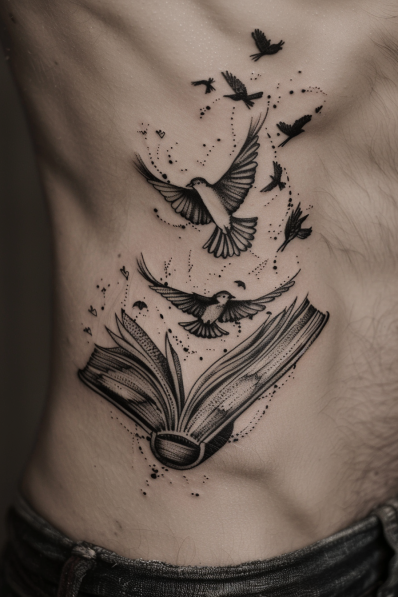 This tattoo beautifully illustrates a floating book whose pages are magically transforming into birds, taking flight into the sky. The black and gray design captures the fluidity of the pages as they lift off, seamlessly turning into delicate birds. The gradual transition from paper to feather creates a stunning visual effect, symbolizing the freedom and limitless possibilities that reading can unlock.