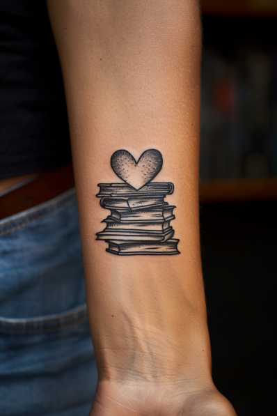 This tattoo features a simple yet meaningful design of a heart perched on top of a stack of books. The black and gray shading gives the books a worn, well-loved look, while the heart adds a touch of warmth and affection to the piece. The design is minimalistic yet striking, perfectly capturing the love and passion for reading.