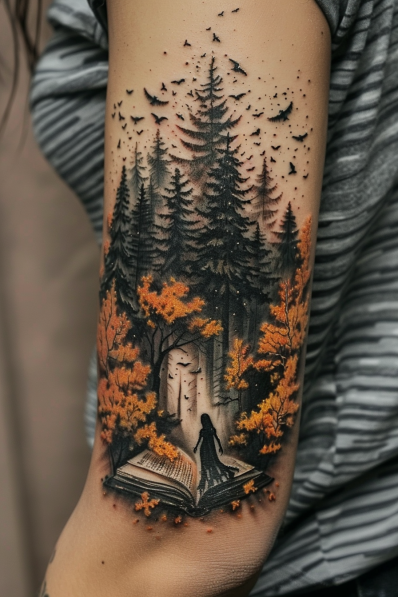 I absolutely love how this tattoo captures the essence of diving into a story. It s as if the entire world within the book is coming to life right on your skin. The contrast between the dark forest and the warm, orange leaves creates a dynamic and eye-catching visual that feels both inviting and mysterious. It s perfect for someone who loves to get lost in a good book, exploring new and fantastical worlds that spark the imagination. This tattoo is not just a piece of art it s a celebration of the adventures that only books can offer.