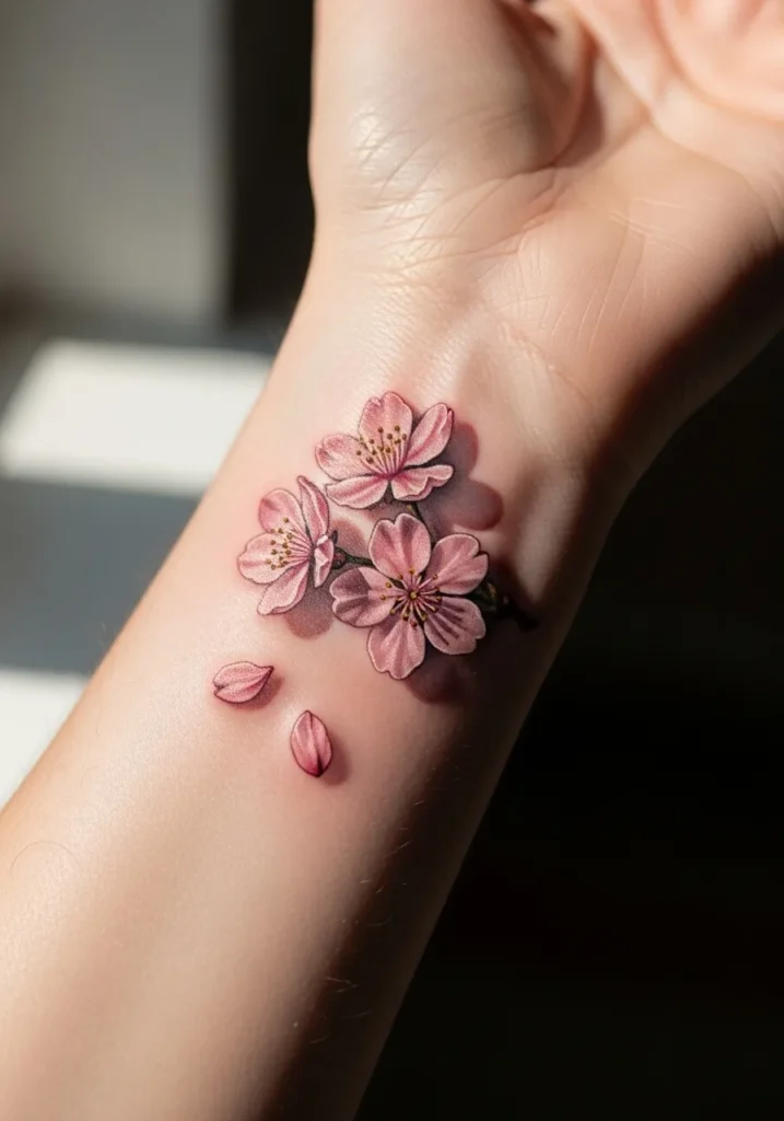 Tiny pink cherry blossoms bloom delicately on the wrist, their soft petals shaded to look freshly opened in the morning sun. The realistic shadows make the flowers look as if they re resting gently on the skin.