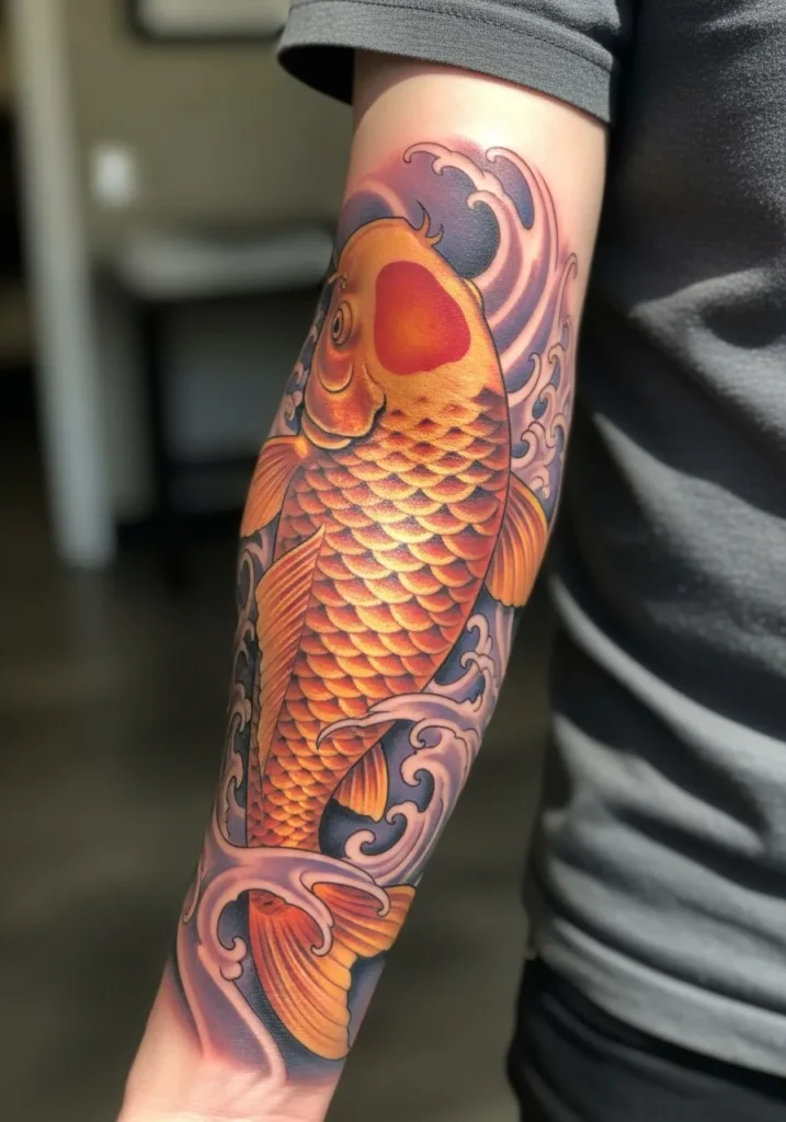 Golden Koi Forearm Tattoo with Flowing Waves