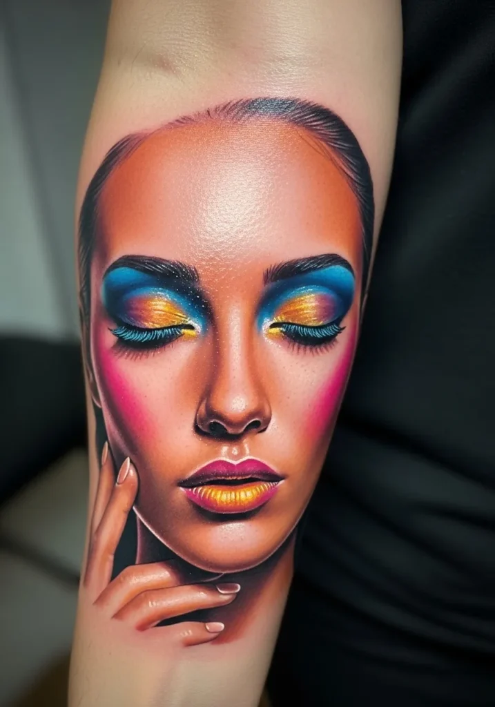 I love how this piece turns the arm into an art gallery. It s modern, fearless, and absolutely bursting with confidence. The makeup colors are bold, but together they create this mesmerizing harmony that feels effortlessly cool.