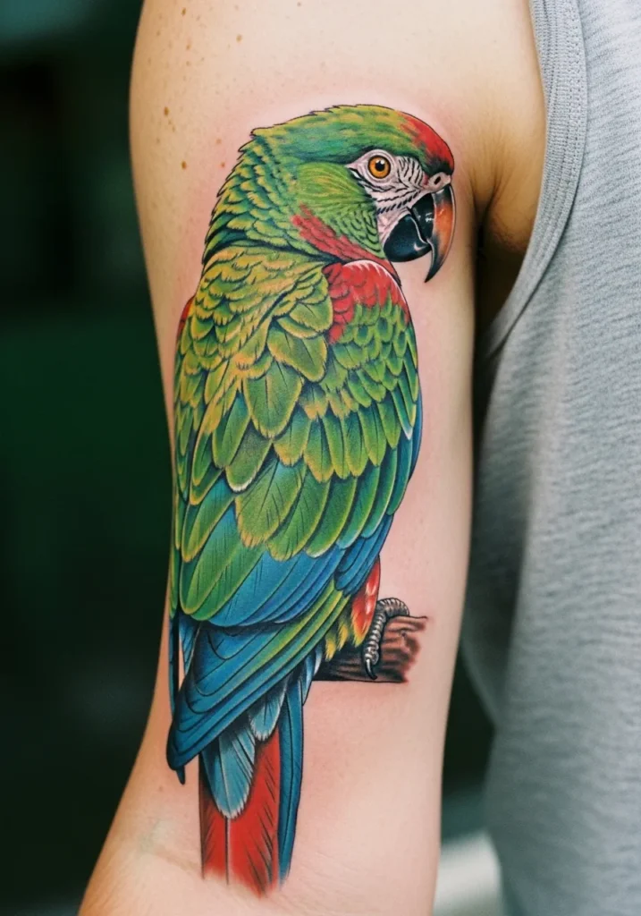 This stunning parrot tattoo on the upper arm bursts with color, from vivid greens and deep blues to rich reds that pop against the skin. The feathers are shaded so intricately that each one looks touchably soft, and the bird s sharp gaze adds that perfect hint of personality.