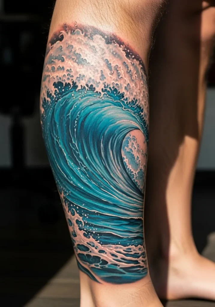 This large tattoo wraps around the calf with a bold, curling ocean wave captured mid-surge. Deep blues and turquoise shades blend perfectly with soft white froth, giving the illusion of movement and depth that feels cinematic.