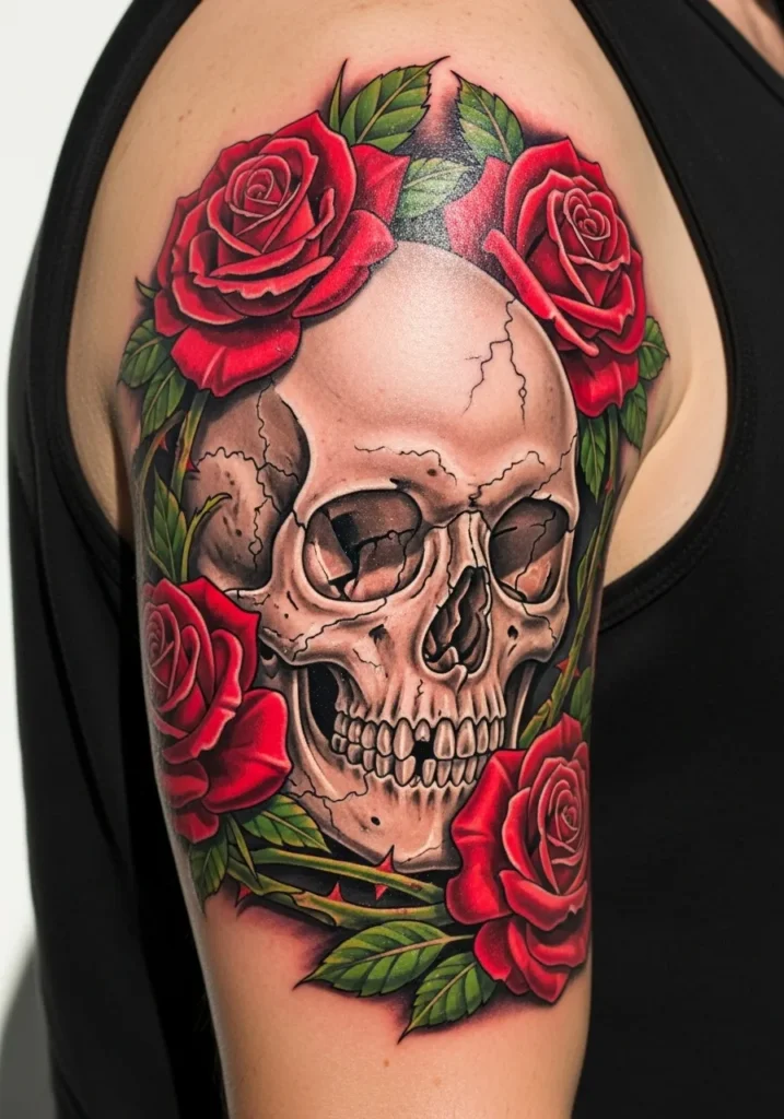 This striking shoulder tattoo features a detailed skull surrounded by vivid red roses and lush green leaves. The color realism brings the contrast between life and death into perfect harmony, while the balance of shading gives it striking depth.