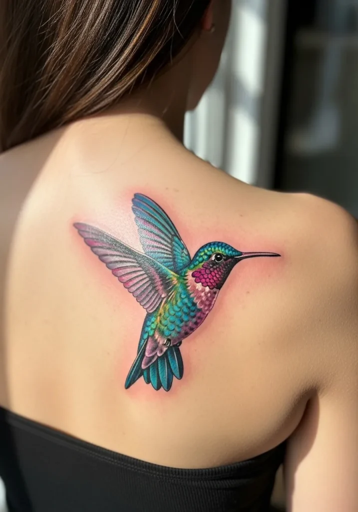 A dazzling hummingbird in motion sits gracefully on the upper back, its feathers painted in jewel-like tones of teal, pink, and purple. The shading and soft lighting make the wings look as if they re fluttering mid-air.