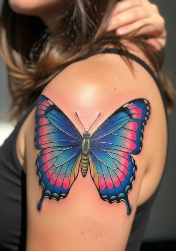 This stunning butterfly tattoo graces the shoulder with radiant hues of blue, pink, and violet. The symmetry of the wings and soft gradient shading make it feel like it might flutter away at any moment.