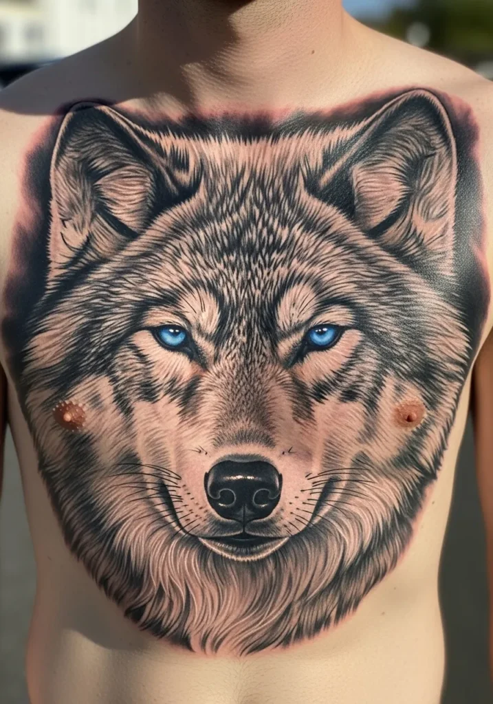 Wolf Chest Tattoo with Piercing Blue Eyes
