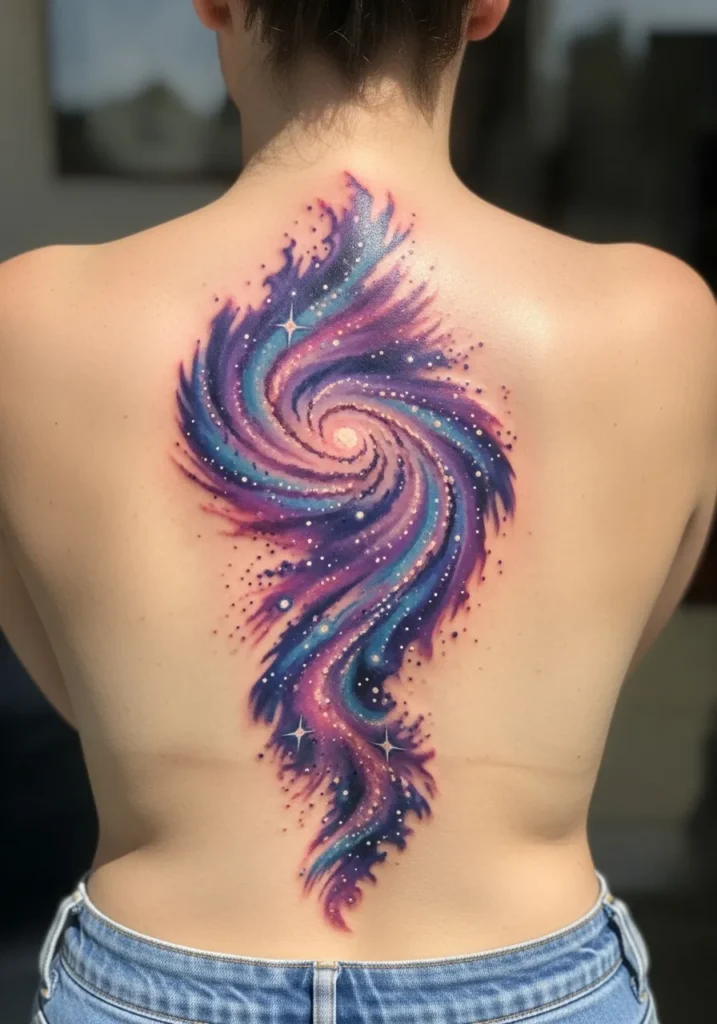 This swirling galaxy tattoo spirals across the upper back in hues of purple, pink, and blue, dotted with twinkling white stars. The soft gradients and glowing highlights give it an almost three-dimensional feel, like a universe painted on skin.