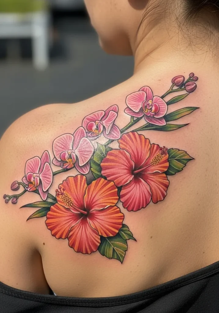 This vibrant shoulder tattoo combines orange hibiscus blooms with soft pink orchids, all framed by lush green leaves. The colors are rich but balanced, and the placement accentuates the shoulder s natural curves beautifully.