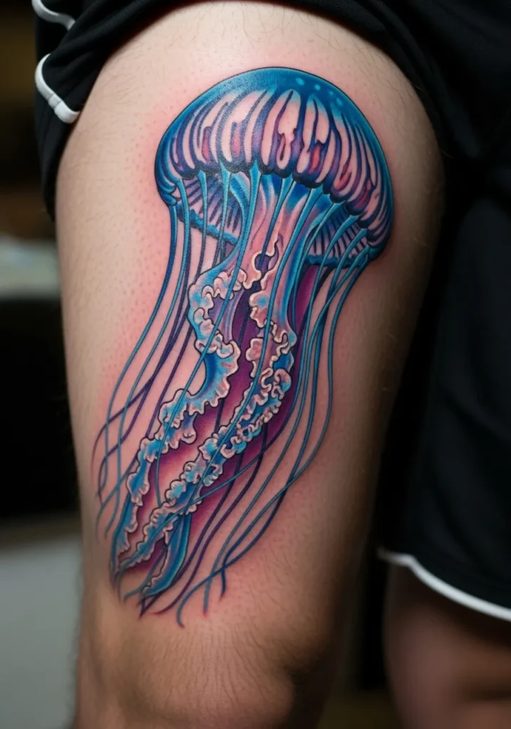 This mesmerizing jellyfish tattoo flows across the thigh in dreamy shades of blue, lavender, and pink. The long, delicate tendrils create a sense of weightless movement, as if it s floating underwater.