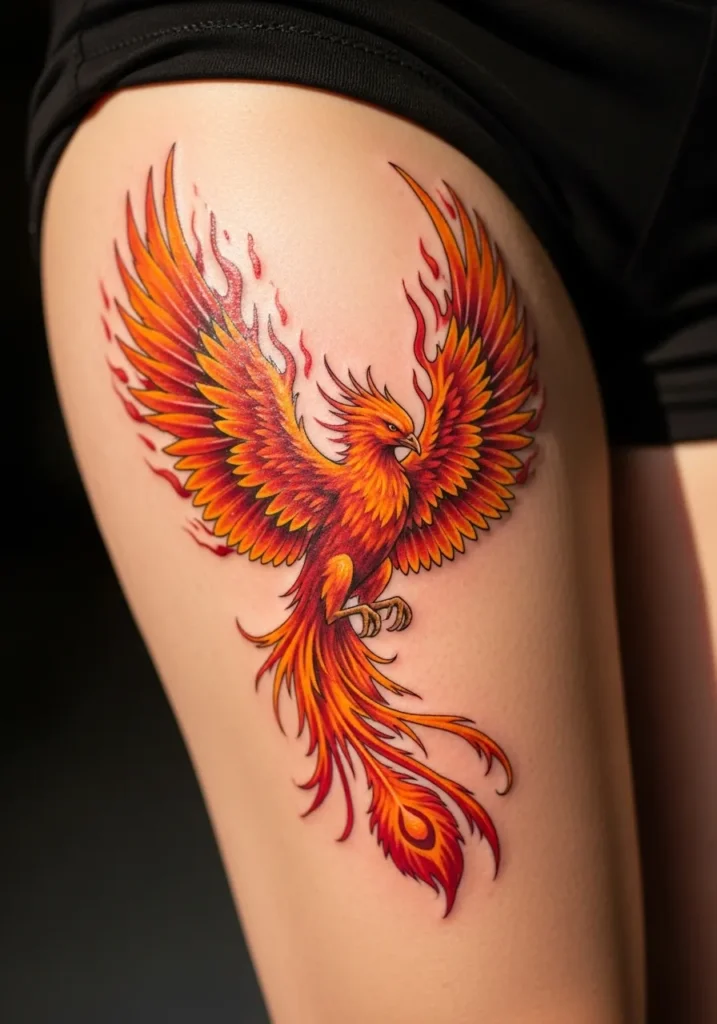 This blazing phoenix tattoo spreads its wings across the thigh, glowing in fiery shades of orange, gold, and scarlet. The feathers blend seamlessly into flame-like edges, creating a sense of power and motion that feels almost alive.