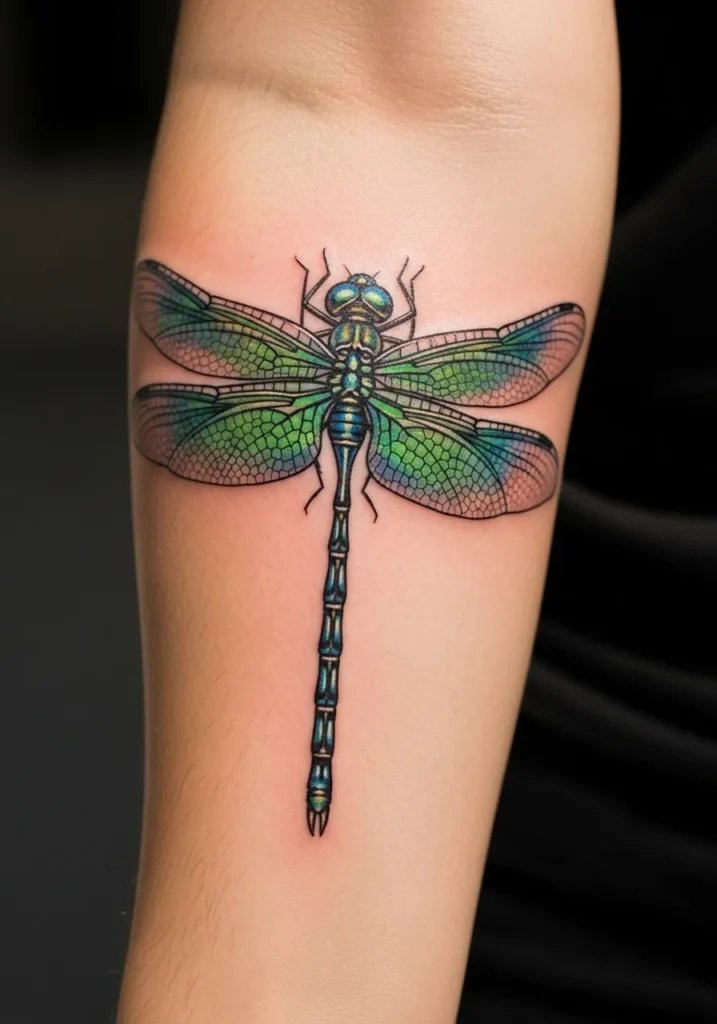 A delicate dragonfly spreads its wings across the arm, painted in translucent greens and blues that glisten as if catching sunlight. The fine linework captures every tiny vein of the wings, giving it a mesmerizingly realistic effect.