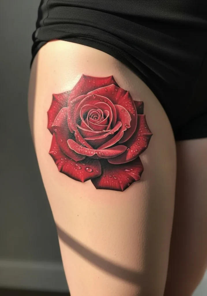 Red Rose Thigh Tattoo with Lifelike Petals