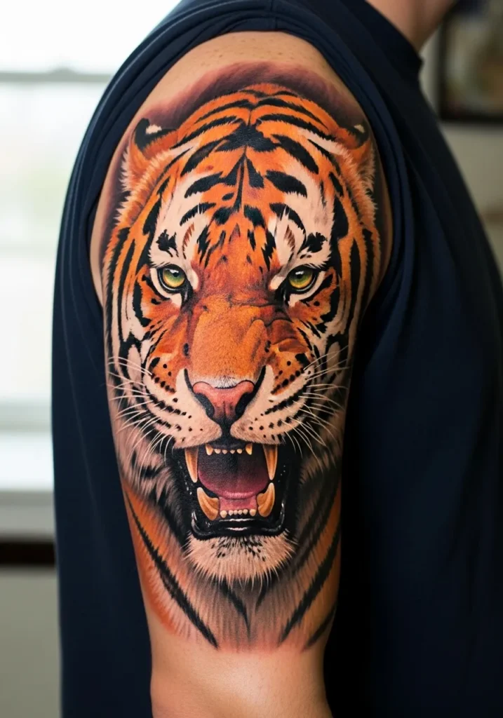 This bold color realism piece covers the upper arm with a roaring tiger that looks ready to leap off the skin. Shades of orange, black, and white blend seamlessly, while piercing yellow-green eyes steal every bit of attention. The texture of the fur and subtle shine in the teeth make it feel almost alive under soft daylight.