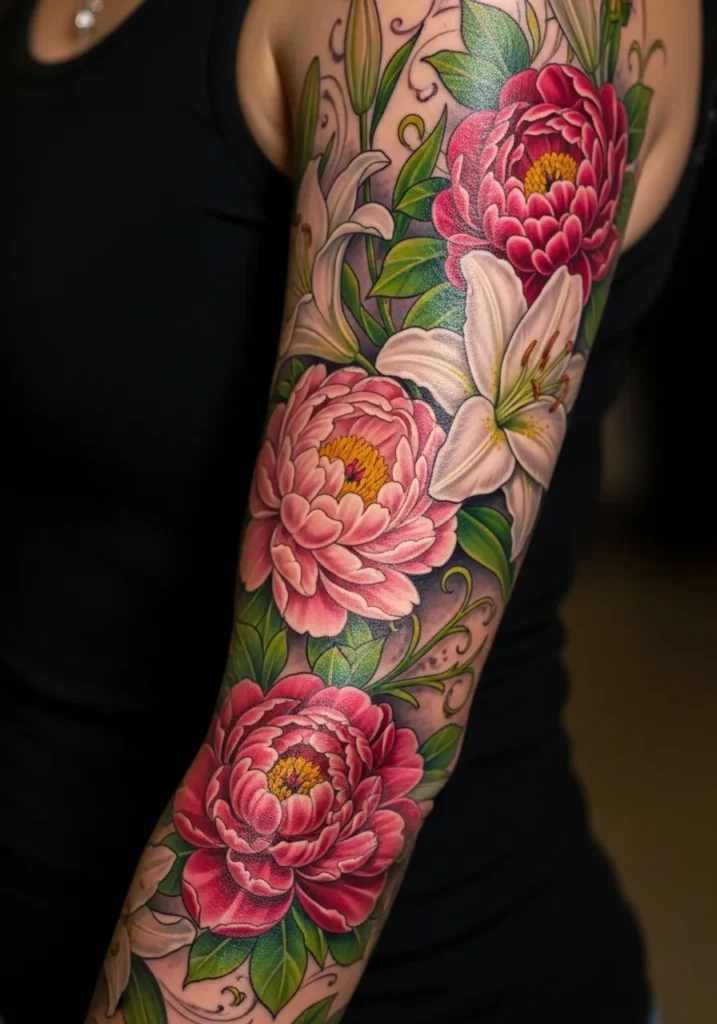 This colorful sleeve bursts with blooming pink peonies and crisp white lilies surrounded by lush green leaves. The details are crisp and radiant, making the flowers almost glow against the skin. Every curve and petal placement feels intentionally graceful, turning the arm into a living garden.