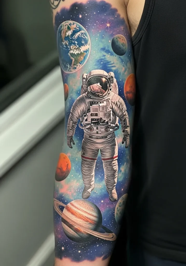 This colorful cosmic sleeve features a floating astronaut surrounded by glowing planets, stars, and swirling galaxies. The vibrant blues, purples, and oranges make the universe come alive, wrapping the arm in a breathtaking space scene. The level of detail in the astronaut suit and planetary textures is unreal.