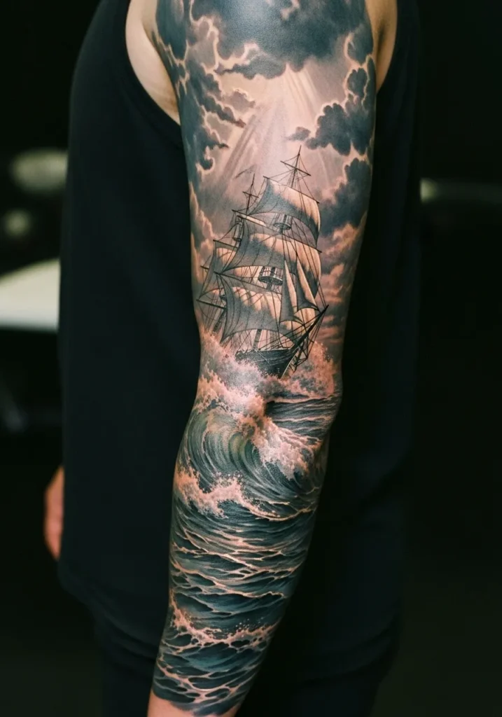 This sleeve captures a majestic ship sailing through turbulent waves under stormy skies. The artist nailed the contrast between dark clouds, crashing water, and faint light breaking through. It wraps around the arm like a cinematic scene in motion, giving depth and movement to every detail.