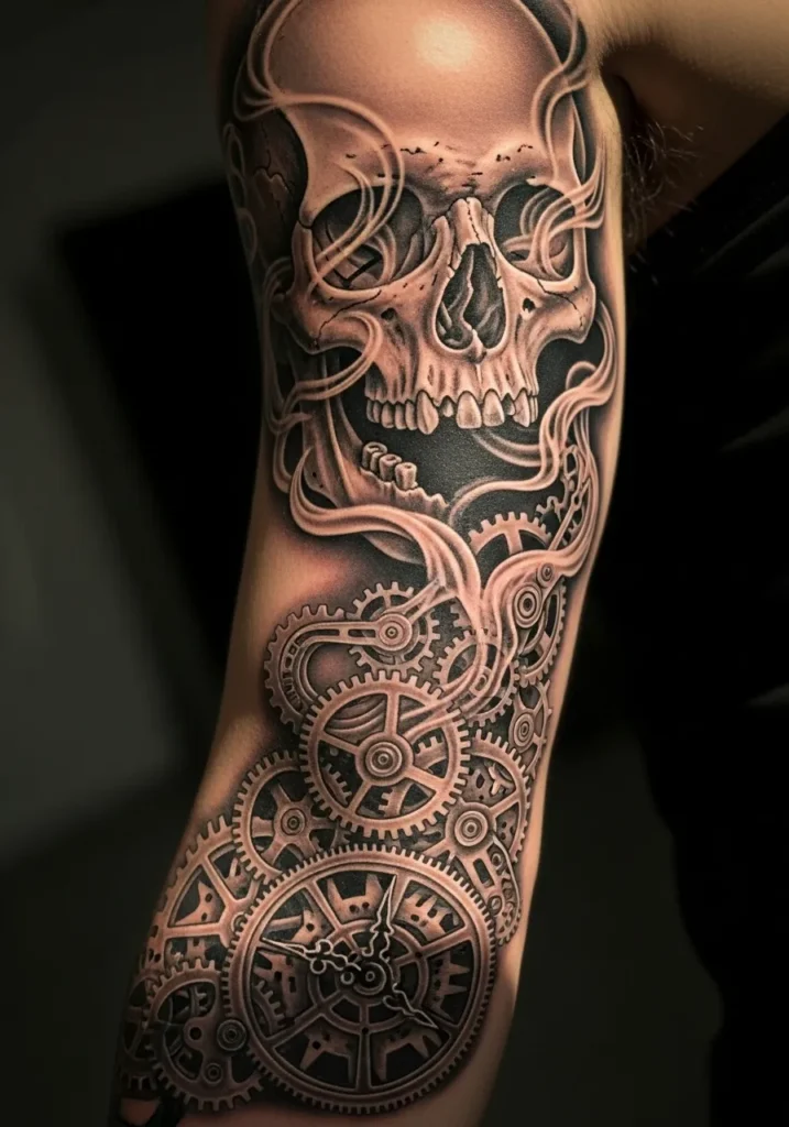 This intricate sleeve blends the structure of a human skull with detailed mechanical gears and smoke-like trails connecting them together. The metallic greys and deep shadows give it an almost cinematic depth, as if flesh and machine have fused into one. The design wraps seamlessly from the shoulder to the elbow, full of movement and contrast.
