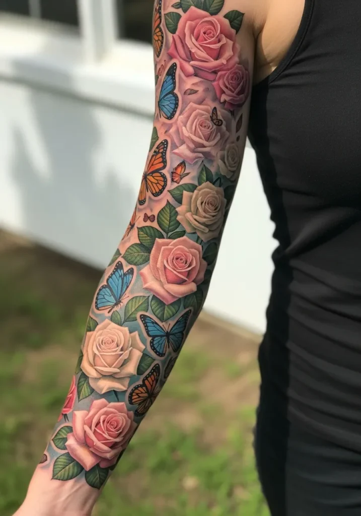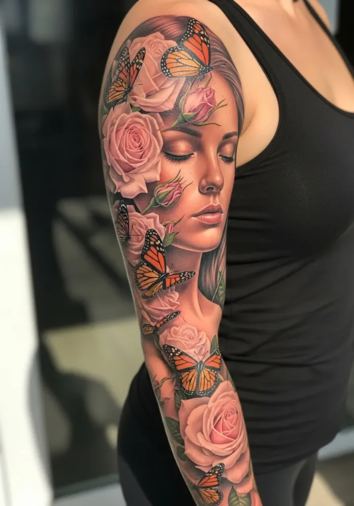 This full sleeve tattoo combines soft pink roses, delicate buds, and monarch butterflies fluttering across the arm. The realism here is stunning, with every petal and wing shaded in natural gradients that make them look alive. The placement flows beautifully from shoulder to wrist, blending the woman s serene face with the floral elements in a seamless, lifelike design.