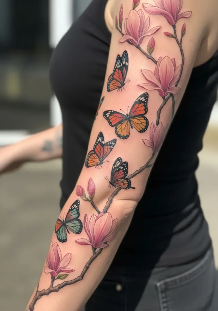 This delicate sleeve blends soft pink magnolia blossoms with fluttering monarch butterflies along slender branches. The gentle shading and smooth color transitions give it a natural, airy feeling that perfectly fits the shape of the arm. The design feels fresh, graceful, and effortlessly feminine.